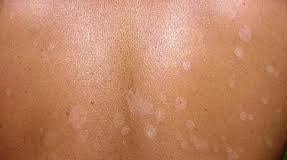 Vitiligo causes pale white patches on the skin that vary in size and can occur anywhere.